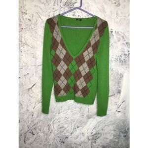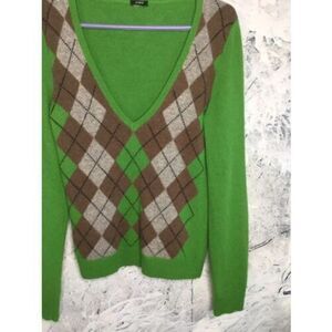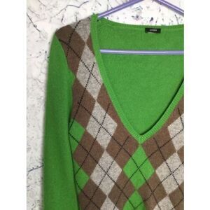 Vtg J. Crew Women's Medium Pullover Green Argyle Pattern V-neck Wool Sweater