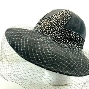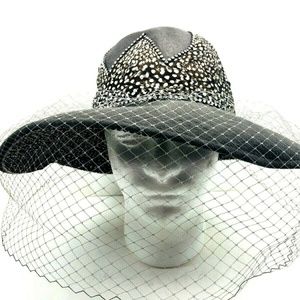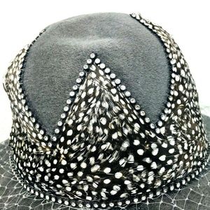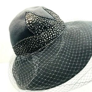 Vtg Jack McConnell Wool Feathers Hat Wide Brim Red Feather Rhinestone Veil Gray.