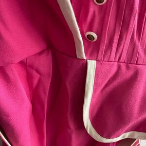 The Vtg Jackie O Mod Fuchsia Pink Shift Dress by Kim Rogers is a stylish and feminine piece that exudes a classic, timeless charm. Made from a luxurious blend of rayon and acetate, this knee-length dress features a round neck, short sleeves, and a zip closure for easy wear. With a lovely pink color and delicate accents like buttons and bows, this vintage-inspired dress is perfect for a variety of occasions from weddings and parties to casual outings and business meetings. The dress's shift silhouette and pencil dress style make it a versatile choice for the modern woman.