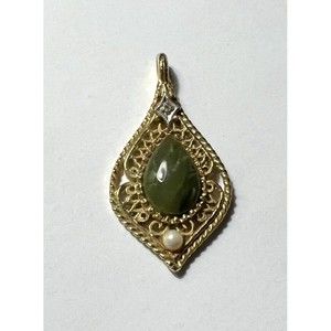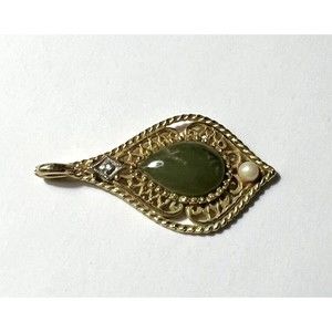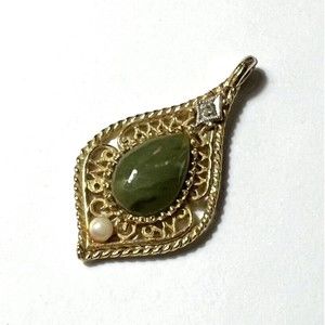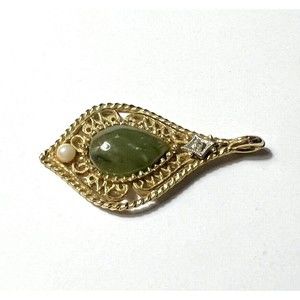 Vtg Jade Genuine Diamond and Cultured Pearl Teardrop Filigree Gold Tone Pendant Pat Pending