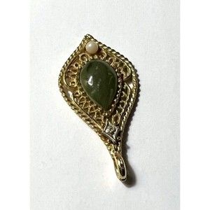 Vtg Jade Diamond and Cultured Pearl Teardrop Gold Tone Pendant Pat Pending