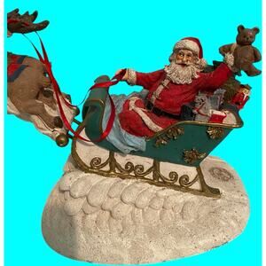• Hand-painted figurine of Santa in a sleigh being pulled by eight reindeer.