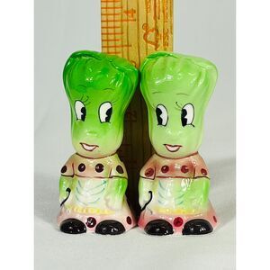 Vtg Japan Anthromorphic Lettuce Leek Ladies Salt and Pepper Shakers Side Eye