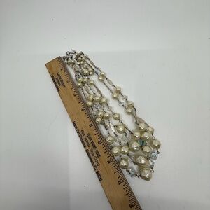 Delicate vintage sparkly triple strand necklace approx 16" plus 3" extender. Silvertone metal fittings and chain, marked Japan. Multifaceted crystals  look like aurora borealis prisms  range is sizes from approx 5MM -12MM, faux pears range in sizes from approximately.  6MM-15MM.  It was my Aunt Ritas ,I think 1950'2-1960's. I wish I knew more about it.very very pretty on, in excellent vintage condition. non smoking home