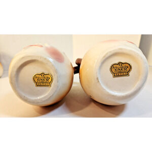 This vintage Japan Anthropomorphic 4 pc Cruet Set includes whimsical faces salt, pepper, oil and vinger shakers in the shape of onions. Made of ceramic with a novelty design typical of the 1950s, this colorful set is perfect for all occasions and adds a unique touch to any kitchen or dining collection. The set is manufactured in Japan by GNCO and includes a salt cellar, pepper shaker, salt shaker, and oil cruet, making it a must-have for collectors of kitchen tools and gadgets.