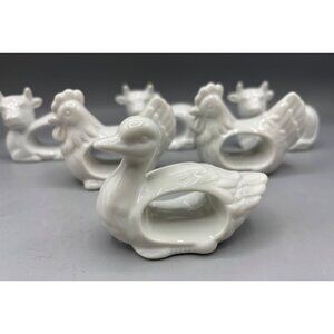 Vtg Japan Set Of 6 White Porcelain Animal Napkin Rings Duck Chicken Cow Farmhous
