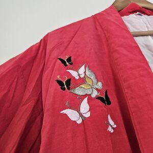 Vtg Japanese 100% Silk Kimono Embroidered Butterflies Red Pockets Open Front