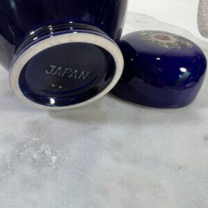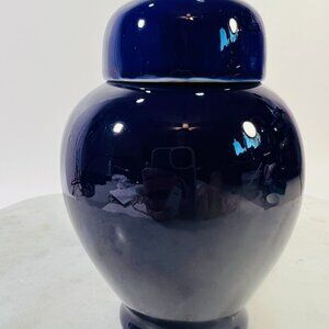 This vintage Japanese ginger jar features a stunning hand-painted floral design. The deep cobalt blue porcelain adds elegance and charm to any space.