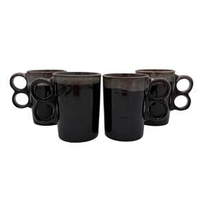 Vtg Japanese Coffee Mugs 2 Finger Drip Glaze Brown Stoneware Set of 4