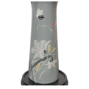 This vintage 10 inch tall Japanese porcelain vase features a fluted design in a sophisticated gray color with elegant gold trim. Adorned with delicate lilies and a graceful butterfly, the vase embodies the beauty and grace of Japanese culture. Handcrafted in Japan, this piece showcases exquisite craftsmanship and attention to detail, making it a collectible item that is sure to add a touch of elegance to any space.