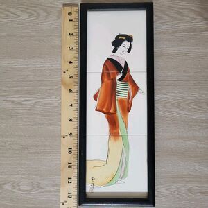 Vintage Japanese Geisha Girl Signed Framed Hand-painted Porcelain Tile 13.5 in X 4.9 in- Enesco Japan