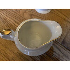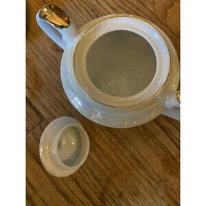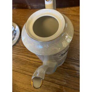 Iridescent China with gold gilt trim and 3D hand painted cake frosting type decorations. Dragon design. Hold the cup up to the light and see a geisha.