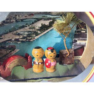 Vtg Japanese Round Diorama Box Kokeshi Figures Mirror Wooden