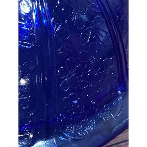 Vtg Jeannette Glass Cobalt Blue 8.5” Serving Bowl. A stunning cobalt blue glass bowl featuring intricate floral and leaf embossing. Ideal as a decorative piece or for serving.