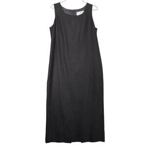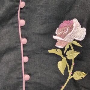 * Features: Linen blend in black with pink trim & embroidered rose on jacket, 2-piece set of a sleeveless maxi dress & jacket, 5-cloth-button closure, 3/4 sleeves, dress has a back zipper & back center slit. Vintage 90s-Y2K era