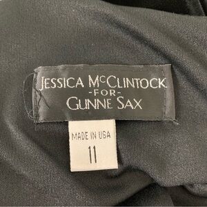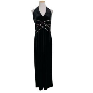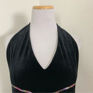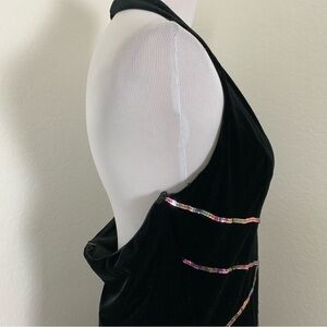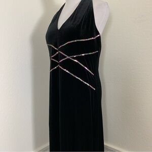 Vintage 80s or 90s? Jessica McClintock for Gunne Sax. Velour Long Gown. Women’s size 11. Square Sequin Criss cross that sparkle rainbow in certain lighting. Back zip closure. Boning on sides. Halter neck. High back slit. Great preowned/vintage condition. Free of rips, holes or stains. Measurements taken flat and unstretched. Armpit to armpit is 18”, waist is 16.5”, hips are 21”, shoulder from top of bust to bottom hem is 55 inches.