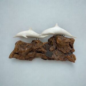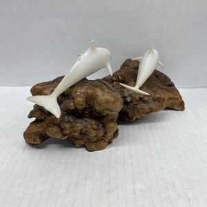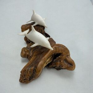 Vtg John Perry 2 White Dolphins On Burl Wood Sculpture Driftwood Beach Nautical