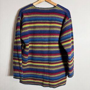 The Vtg Jones New York Sport Lambswool Striped V-Neck Sweater Pullover is a vintage women's small sweater made of wool with a tight-knit fabric. It features a V-neckline, long sleeves, and a cap sleeve style. Perfect for various occasions such as travel, parties, casual outings, and business events, this multicolor striped sweater has a relaxed fit and a collarless design. The sweater also has a nature-themed style with elements of Christmas, hippie, bohemian, and retro aesthetics. Made in Hong Kong, this lightweight and breathable sweater is ideal for the winter, fall, and spring seasons.
