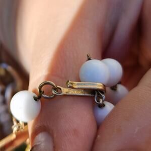 This is an absolutely stunning double strand necklace signed by vintage designer Jonné (House of Schrager). You can find the signature on the inside of the shepard hook. This piece is comprised of white smooth milk glass beads as well as faceted ab coated milk glass beads. It also has several faceted givre glass beads where the milk color has been injected into the glass. I tried to include a photo so you can see, givre glass is highly collectible. This piece has it all! Adorned with gold tone spacer beads and bead caps. This piece has an extender and will fit between a 16" and 18" neck line, which is a great size, considering most necklaces were extremely small in the 50s. Very rare and collectible piece. An excellent piece for any vintage jewelry collector! Great preowned condition, all photos taken in natural lighting.