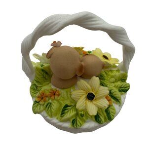 Sweet vintage Josef Originals “Basket of Love” figurine featuring two adorable puppy dogs nestled in a textured white basket surrounded by yellow and orange flowers. Crafted from Georgian fine bone china, it shows classic Josef charm with gentle pastel accents and expressive little faces.