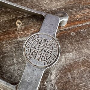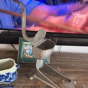 Very nice vintage aluminum juicer. Shows no damage or access where. Nice accent for a country kitchen and usable.