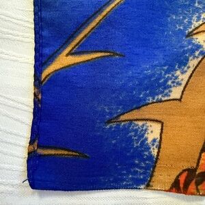 Design: Bold jungle scene with leaping tigers and leopards among tropical foliage in cobalt blue, orange, gold, and brown. Most consistent with late 1980s–1990s oversized fashion scarves.
