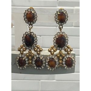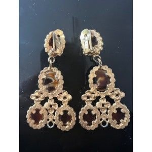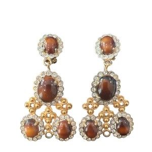 Vtg KJL Chandelier Earrings Clip on Brown Cabochon Rhinestone Dangle 60's
