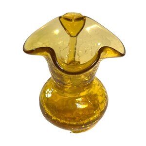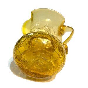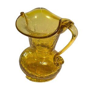 A charming Vintage Hand Blown Crackle Glass Yellow Amber Mini Pitcher Creamer ready to add a touch of elegance to your kitchenware. Perfectly sized at 3", it's a delightful blend of vintage style and functionality.