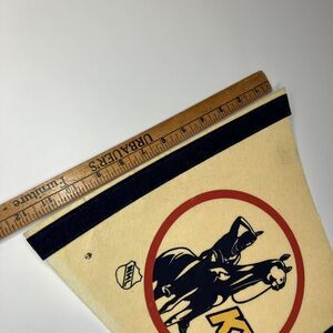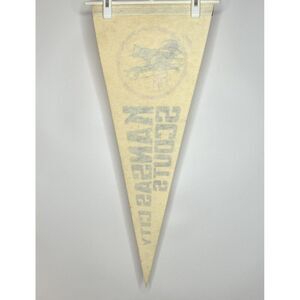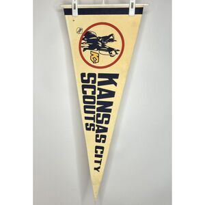 A vintage Kansas City Scouts NHL 30x12 full size hockey pennant from the 1970s. Felt is crisp but original white is discolored to yellow-ish. Stitching at top intact; border has a few pinholes. Point is intact but has wrinkles and pinholes. Some soil and faint marks consistent with age and use. Stored stacked and flat. Shipped lightly rolled in large box. Please see photos for complete description.