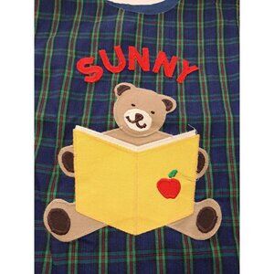 A charming addition to any child's wardrobe, this Kelly's Kids jumper dress features a playful bear applique and "Sunny" embroidery. Its vibrant plaid pattern and button shoulder closures combine style and practicality, ensuring comfort and ease of wear.