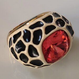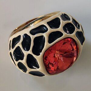 This vintage Kenneth Jay Lane KJL cocktail ring features a unique giraffe design in black and cream enamel with a huge pink and orange crystal. The crystal reflects both pink and orange depending on the light. Quite beautiful. The statement ring is set in yellow gold-plated metal. The ring is a size 7 and perfect for women who appreciate bold and beautiful jewelry pieces. This rare piece is infused with themes of beauty, art, animal, and style, making it a standout accessory for any vintage lover. Excellent vintage condition.