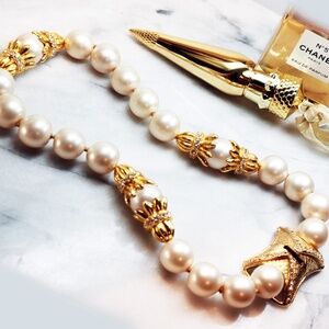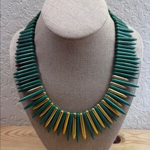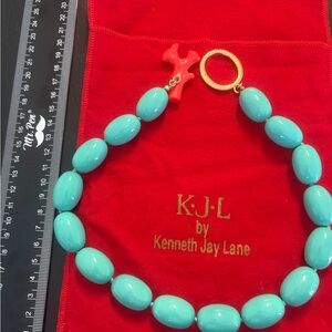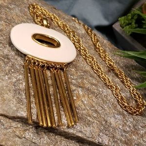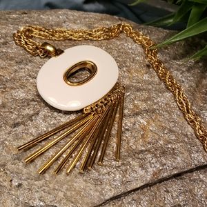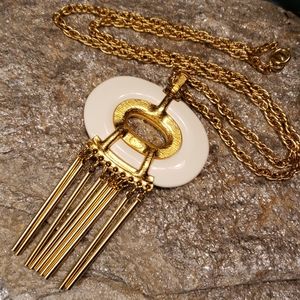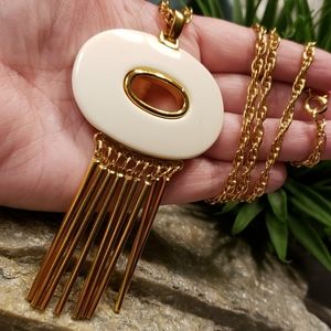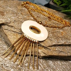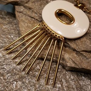Here is a super unique authentic vintage Kenneth Jay Lane (KJL) designer necklace. It is made in a bright Gold tone metal with an eye catching Cream Lucite oval with unique long rod like Gold tone metal tassels. The piece is signed on the back in a oval plate "Kenneth Lane", this stamp has faded but can be distinguished best at an angle as seen in the picture. Estate fresh to you? Thank you for stopping by my closet!