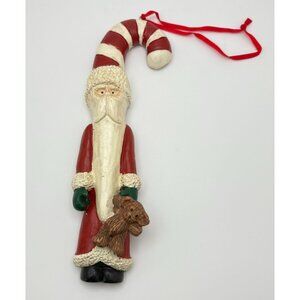 This intricately detailed Santa Claus ornament captures the essence of holiday cheer with its candy cane hat and charming teddy bear. Crafted to enhance festive decor, it adds a classic touch to any Christmas setting.