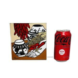 Vintage L Kuhne Chilies Native American Ceramic Tile Trivet Pots Corn Etc Wall Art 6” x 6”