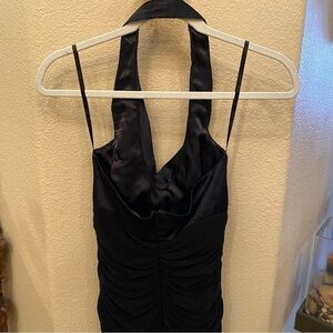 Pre-owned in great condition with no rips or stains. Women’s vintage black halter top maxi dress. It has ruching on the sides and back. Y2K style. Zipper on the back. Upper halter top is silk. Bottom has nice stretch. Nice elegant dress for cocktails, parties, weddings etc. Dry clean only. Comes from smoke and pet free home.