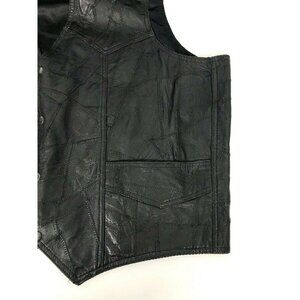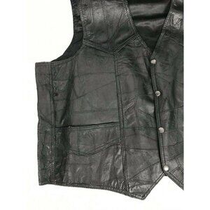 LC Leather Club genuine leather vest in size 54, featuring a snap front closure and patchwork leather design. This classic black leather vest is fully lined for comfort and includes front pockets plus an inside pocket for added storage. Perfect for bikers, Western wear, casual streetwear, or rocker style, this vest offers a rugged, timeless look. Great for layering over a flannel or tee for an effortlessly cool outfit! Dry clean only to maintain the quality and longevity of the leather.