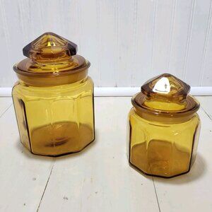 This is a set of 2 vintage L.E. Smith 10-panel amber glass apothecary canister jars with lids, likely made in the 1960s. They are decorative and functional pieces that were originally used to store medicinal herbs but are now commonly used for kitchen storage or display. They feature a lift-off lid design and are made of thick, transparent, golden amber glass.