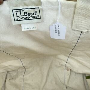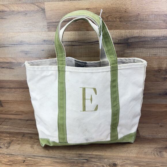 The Vtg LL Bean “E” Boat Tote Small Bag in Natural with Olive Green is a vintage canvas tote bag featuring a solid pattern with a zip closure and green handles/straps. It is a small size with dimensions of 13" by 9.5", perfect for carrying essentials while on the go. The bag is in a natural exterior color with an olive green handle/strap color, making it a versatile and stylish accessory for both men and women. Made in the United States by L.L. Bean, this tote embodies a nature-themed style that is both timeless and practical.