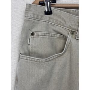 This vintage pair of L.L. Bean Men's Double L Natural Fit Jeans in a beige color is a classic addition to any wardrobe. Made in the USA with a denim fabric type, these pants feature a high-rise and a 5-pocket design with a zipper and button closure. Perfect for casual, workwear, or travel occasions, these chino-style jeans are comfortable and versatile for all seasons. The straight leg and flat front design adds a preppy touch to the retro 90s grunge style, making them a timeless choice for any nature-loving hipster.