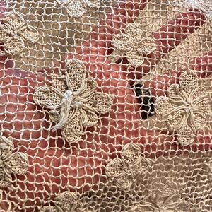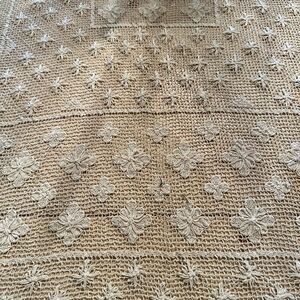 hand-crocheted lace tablecloth. The large rectangular size of 75" by 53" makes