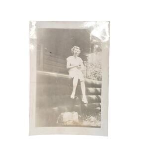 Vtg Lady in Front of Cabin Original Monochrome Photo 1946 Found Snapshot