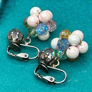 These Clip-On Earrings feature a stunning cluster design with silver-tone metal, accented by pink and white faux pearls, yellow and AB (Aurora Borealis) rhinestones that shimmer with a rainbow of colors. The earrings are adorned with delicate faux pearls and pastel beads, creating a soft, elegant look. The dangle drop style adds a touch of movement, making these earrings a timeless accessory that enhances any outfit with vintage charm.
