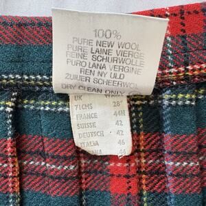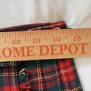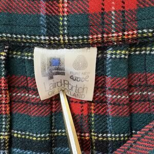 This vintage Laird Porch of Scotland red tartan plaid wrap skirt is made of 100% pure wool, making it a warm and durable garment perfect for the winter, fall, and spring seasons. The Renwick Ancient Tartan pattern adds a touch of Scottish heritage and retro style, while the black leather buckle closures and midi length make it versatile for various occasions from casual to formal. There are some small holes on the front. Please refer to the pictures. With a waist size of 27-29 inches and length of 26.5 inches, this wrap skirt is a unique and stylish addition to any woman's wardrobe, showcasing the quality and craftsmanship of its Scottish origin.
