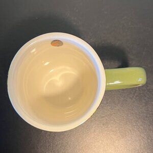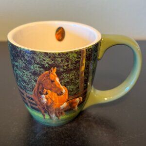 Striking horse ceramic mug with wrap around stunning artwork by Chris Cummings featuring a chestnut mare and colt with white markings standing together in front of a wooden fence and a thick woods of green trees. An oval cameo headshot of the horse peaks out below the white interior rim. Large, comfortable, easy-to-grip, green handle. Microwave and dishwasher safe. Measures 3.75” tall with a 3.25” diameter; 5” across including handle. Holds 10 fluid oz.