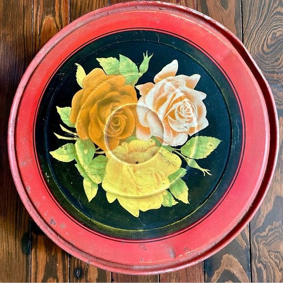 This listing is for a lovely large, round, vintage or antique tin featuring three cabbage roses. Roses are a pleasantly faded, reddish, yellow, and peach color. There is some minor shallow, denting and paint loss. The bottom has some surface rust. Absolutely nothing that detracts from this lovely old tin. An unusually large size, it measures 12 inches in diameter, and more than likely once held English biscuits or crackers. I purchased this about 25 years ago in Massachusetts. Being sold as is as found as I’ve always had it. Thanks for looking !! ❤️