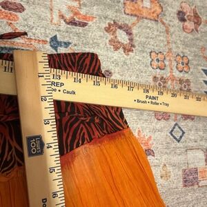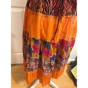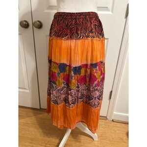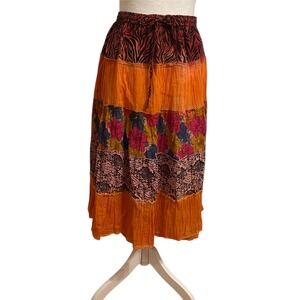 Vtg Large ethnic broomstick crinkle gypsy tiered skirt orange mixed print boho