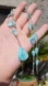 This is a very nice vintage natural larimar wire wrapped station lariat necklace. It features one large teardrop shaped pendant with several small teardrop shaped stones that make up the neckline.  Each stone is individually wire wrapped and linked together with a silver tone aluminum metal. Features a shepards hook clasp. Will fit up to a 19" neckline. Great preowned condition, all photos taken in natural lighting.