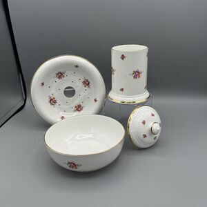 This is a Laura Ashley "Parfums" fine bone china bathroom set. It is a discontinued pattern featuring a pink and yellow floral design.