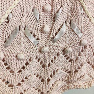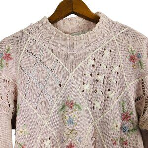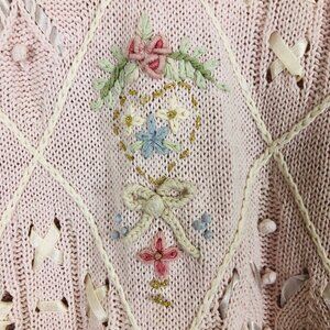 Vtg Laura Gayle Floral Embroidered Knit Sweater Sz Large Floral Pink Ribbon