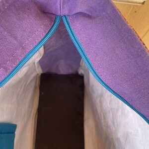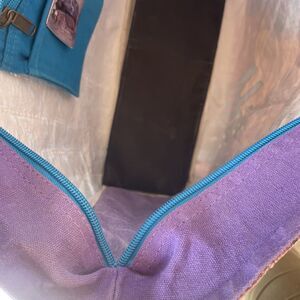 This is a great tote bag. It has been used and loved. Has been used for the beach, groceries, travel, you name it. This bag has done it all and can do it all still. The zipper on the top no longer works, and the charm/zipper has fallen off. Heavy canvas that is waterproof on the inside. Removable bottom insert. There is a zip pouch as well as a sunglasses or cell phone spot inside. There are marks on the outside please see all pictures. No holes through the bag, but it may need some TLC from the next owner, depending on what you want to use it for